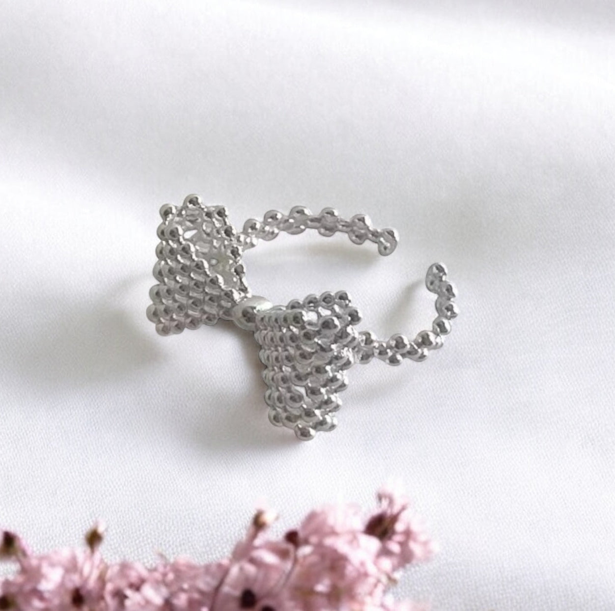 En fin og håndlavet ring i sterling sølv med en sløjfeformet front og små perleformede detaljer, der giver et let og elegant udtryk. Ringen fungerer både som et feminint hverdagssmykke og til festlige looks.