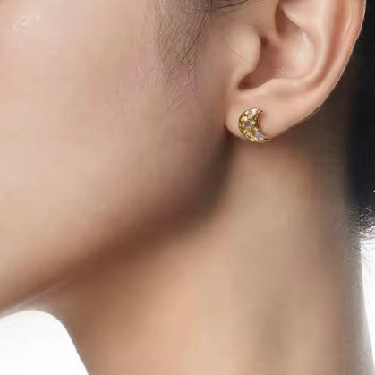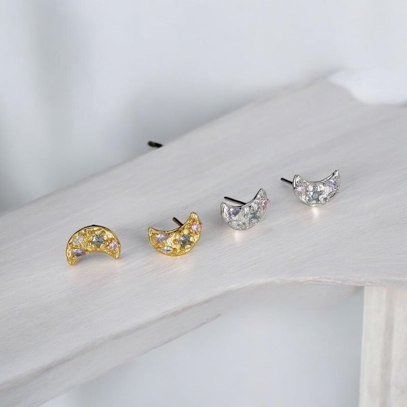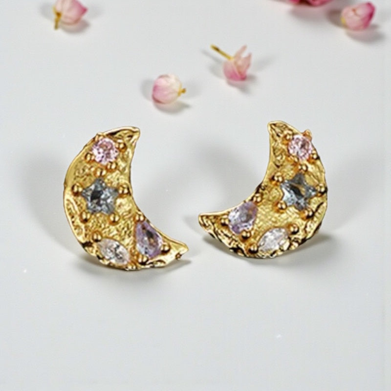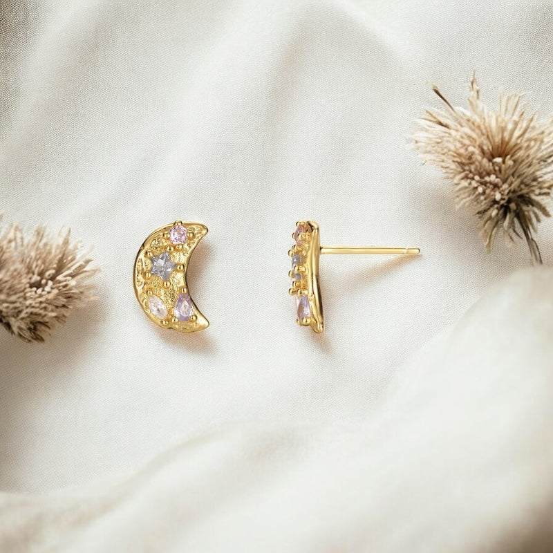 Måneformede ørestikker i 18k forgyldt sterling sølv med små pastelfarvede zirkonia. Et stilrent og feminint design, hvor farverne giver et blødt og harmonisk udtryk. Let at bruge både til hverdag og fest.