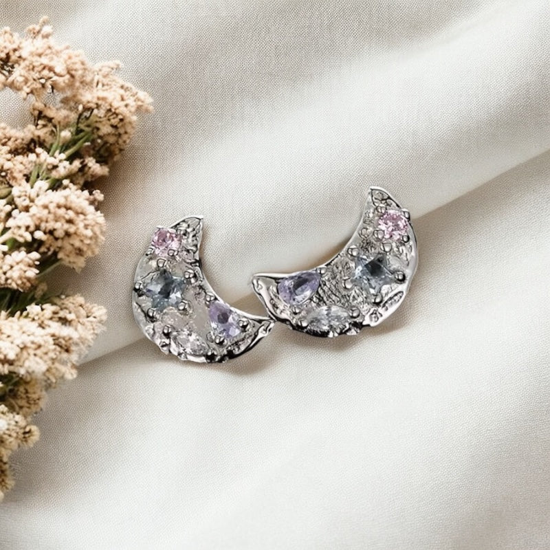 Måneformede ørestikker i sterling sølv prydet med små pastelfarvede zirkonia. Et stilrent og let farverigt design, der giver et fint og moderne udtryk. Perfekt til hverdag og særlige anledninger.