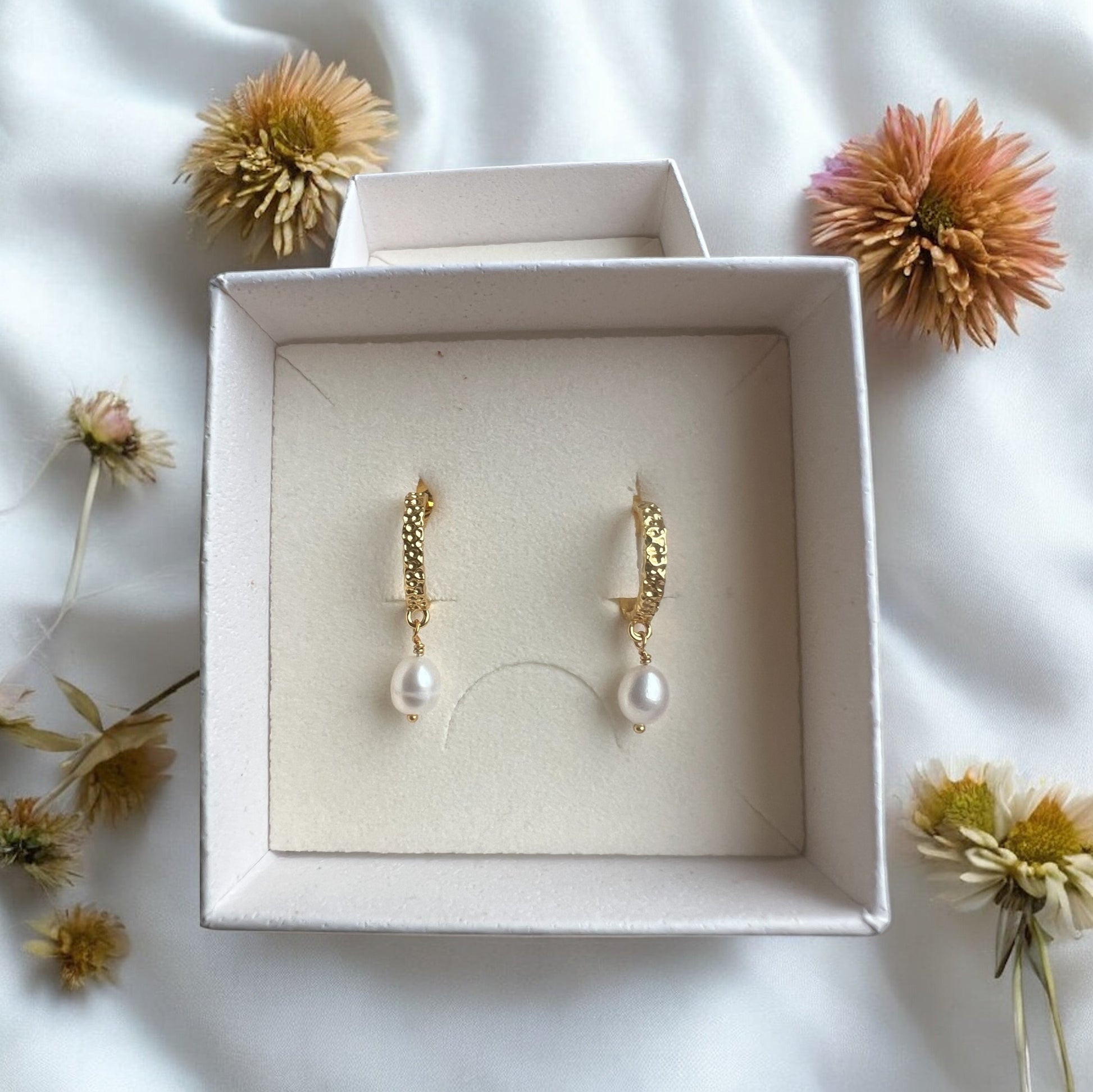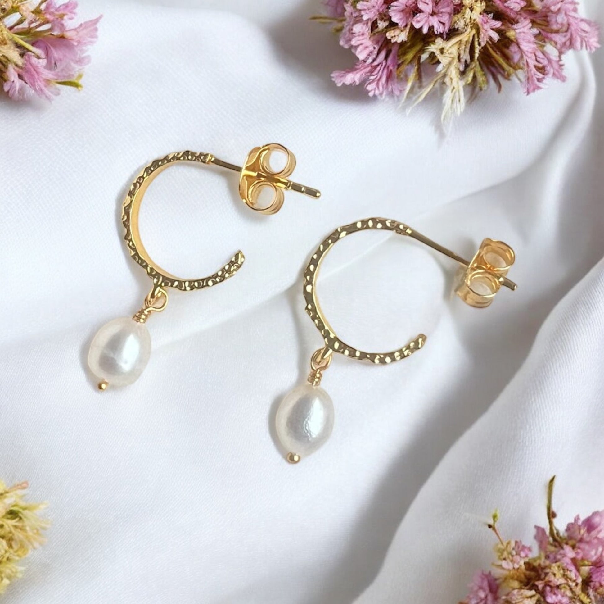 Søde, enkle øreringe med ferskvandsperler. Øreringene er belagt med et tykkere lag guld og coating, som gør at forgyldningen holder længere.