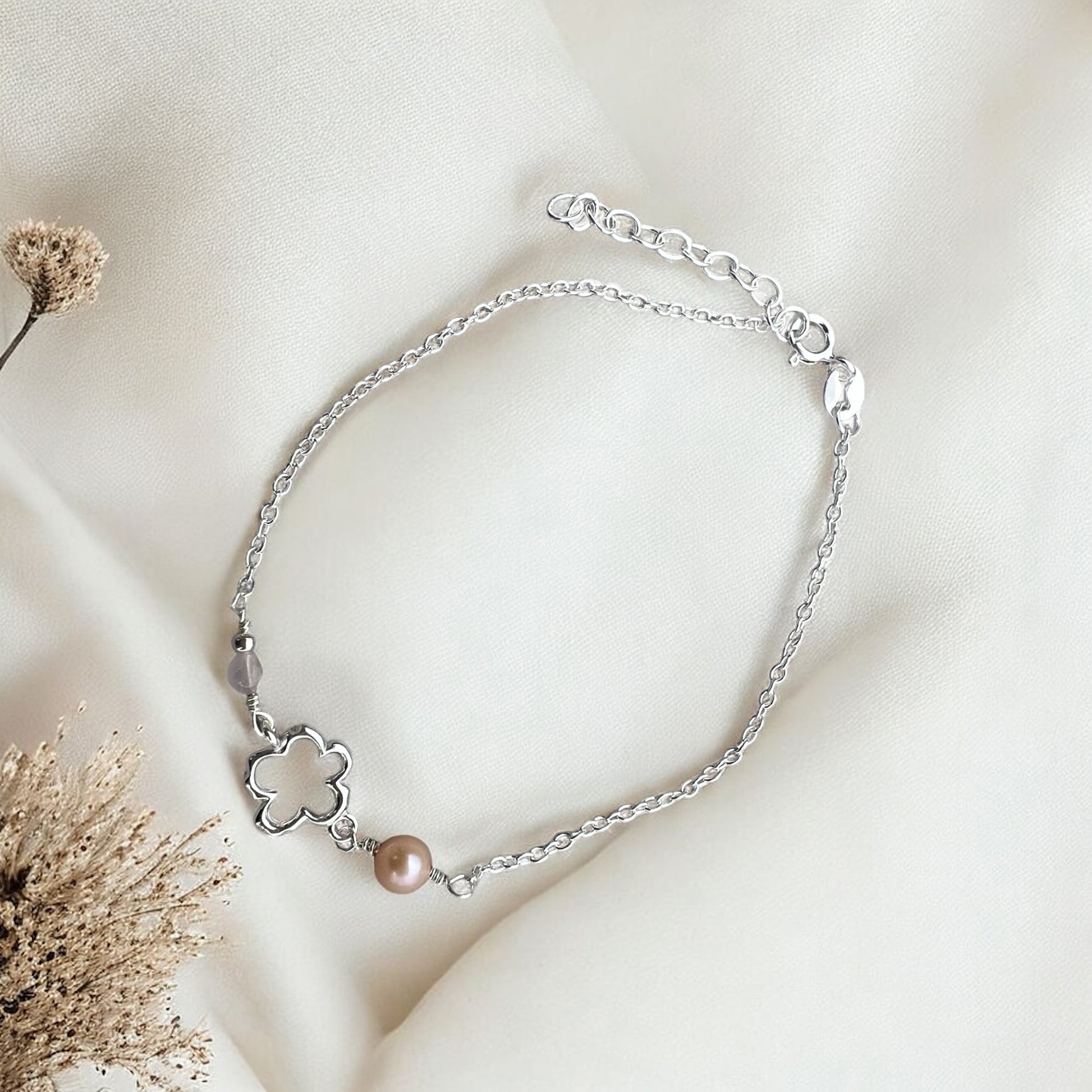 Flora er et let og feminint armbånd med rosa ferskvandsperle, rosakvarts og et blomsterelement i midten. De enkelte dele er sat sammen med en fin kæde i sterling sølv og danner et enkelt, afbalanceret udtryk.