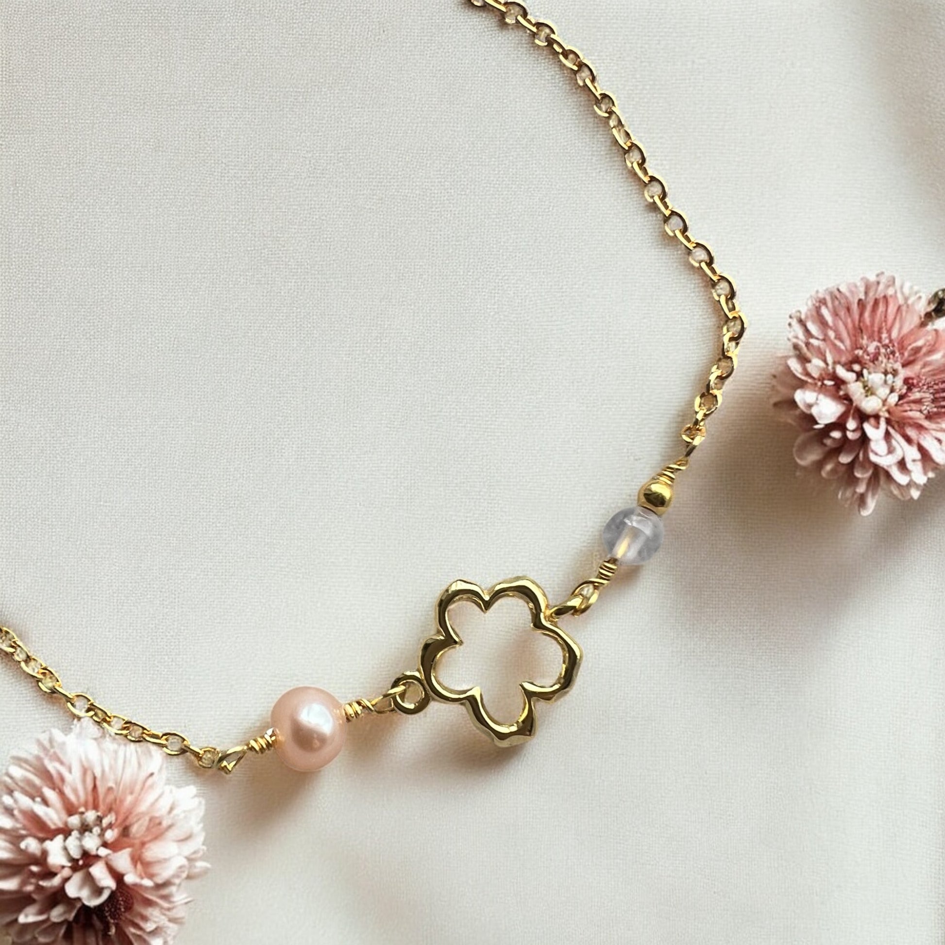 Flora er en enkel og feminin halskæde med rosa ferskvandsperle, rosakvarts og et blomsterformet led i midten. Kæden er lavet i 18k forgyldt sterling sølv og har en let, balanceret opbygning med fine detaljer og blide farver.