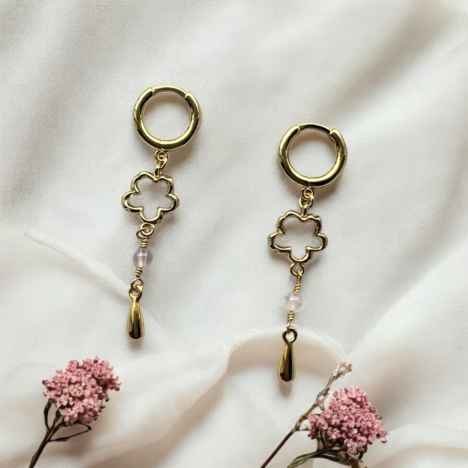 Flora er et par enkle og elegante kreoler i 18k forgyldt sterling sølv med blomsterled, rosakvarts og små dråbeformede vedhæng. Øreringene har en let bevægelse og et rent udtryk, som gør dem nemme at bruge til både hverdag og fest.