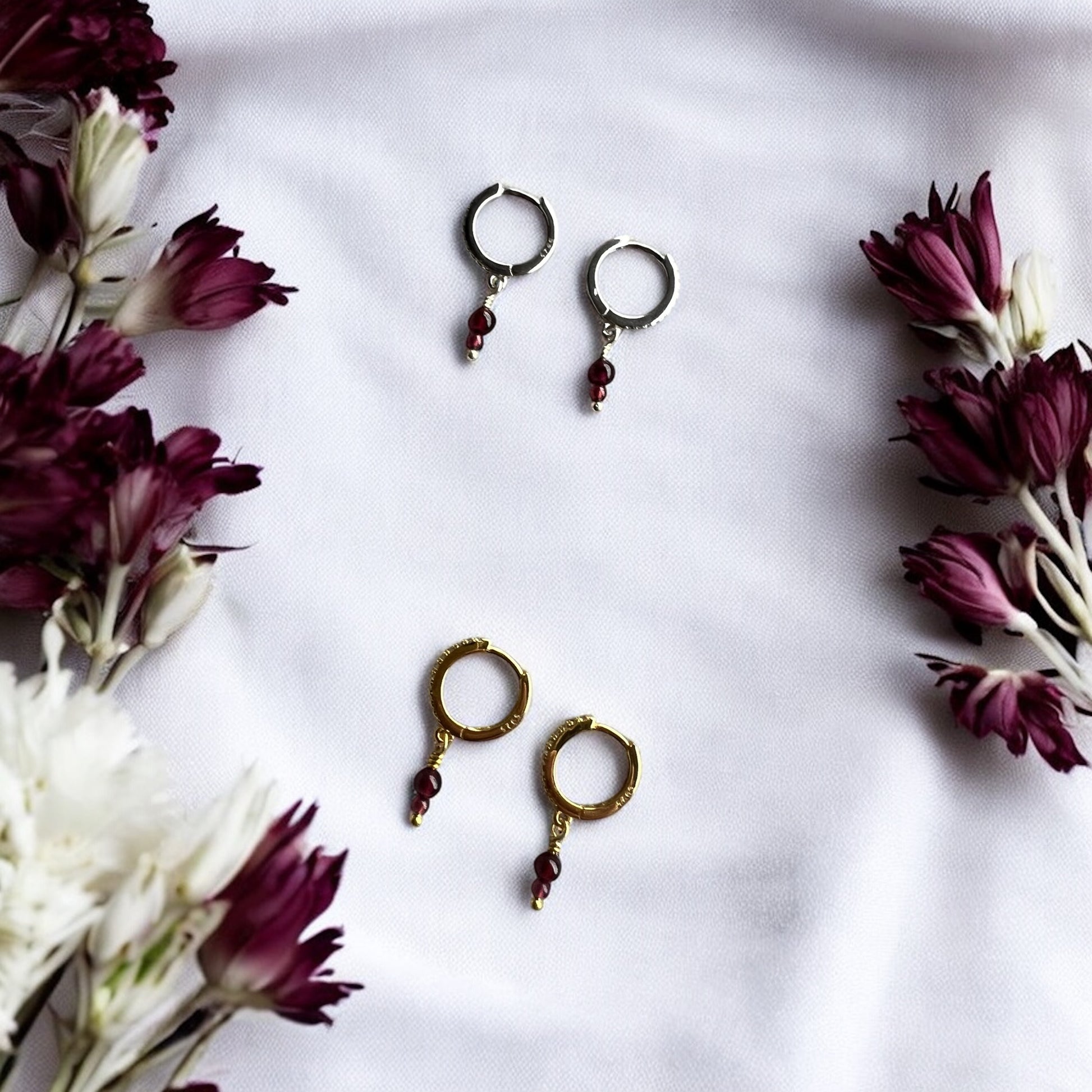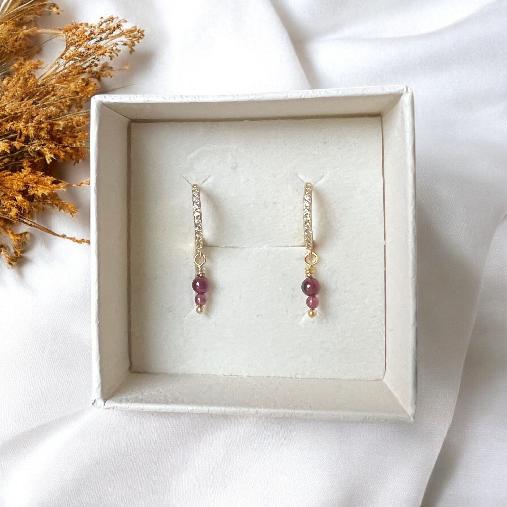 Lille kreol i 18k forgyldt sterling sølv med små zirkonia-sten og vedhæng af rød granat og forgyldt sterling sølv.
