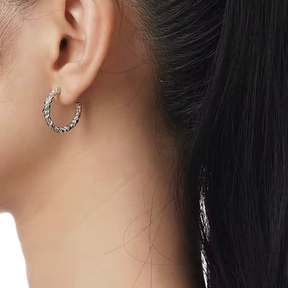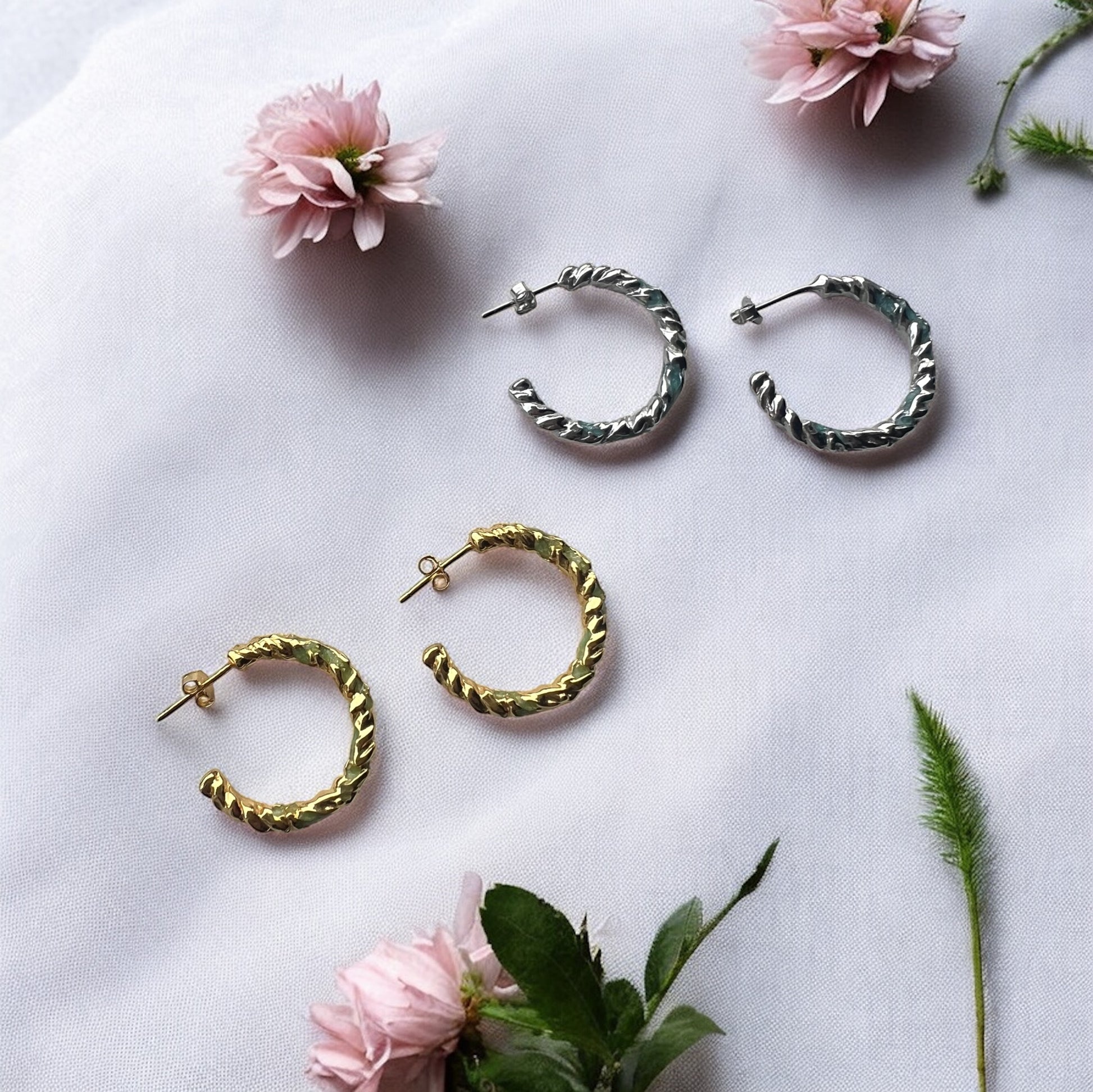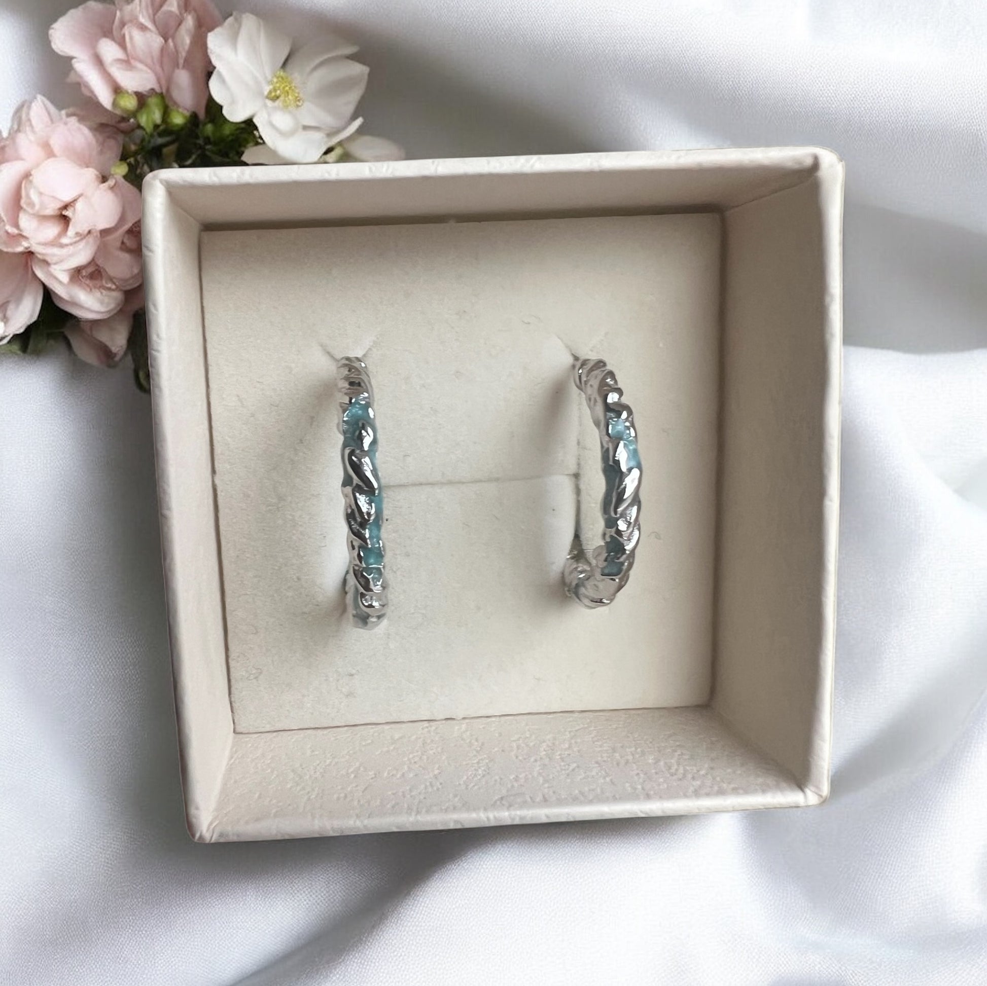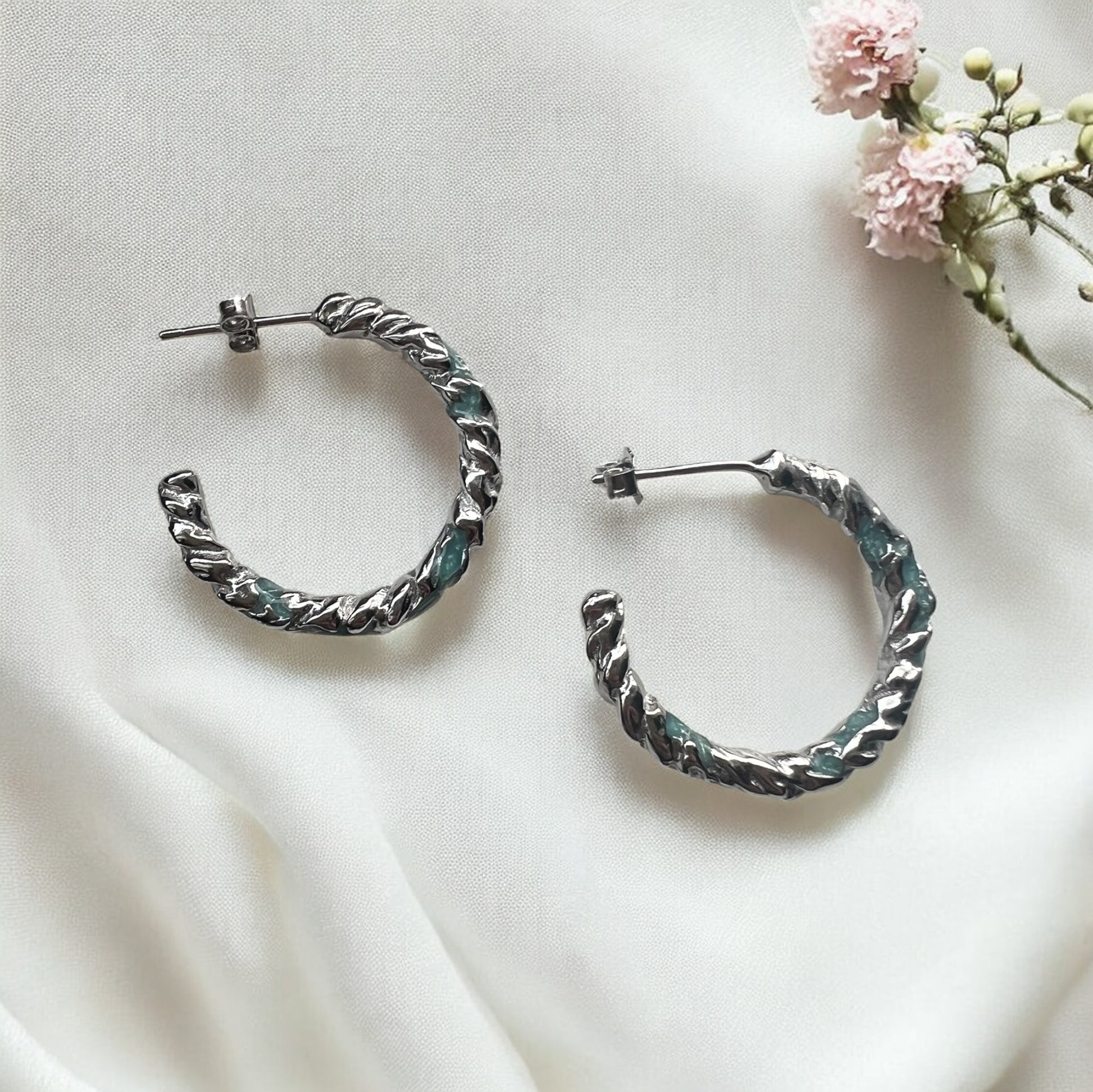 Chunky, åbne kreoler i sterling sølv med snoet struktur og mørkegrøn enamel, som giver et roligt, farverigt spil mod sølvet. Et moderne og let udtryk, der gør øreringene nemme at style både til hverdag og mere festlige looks.