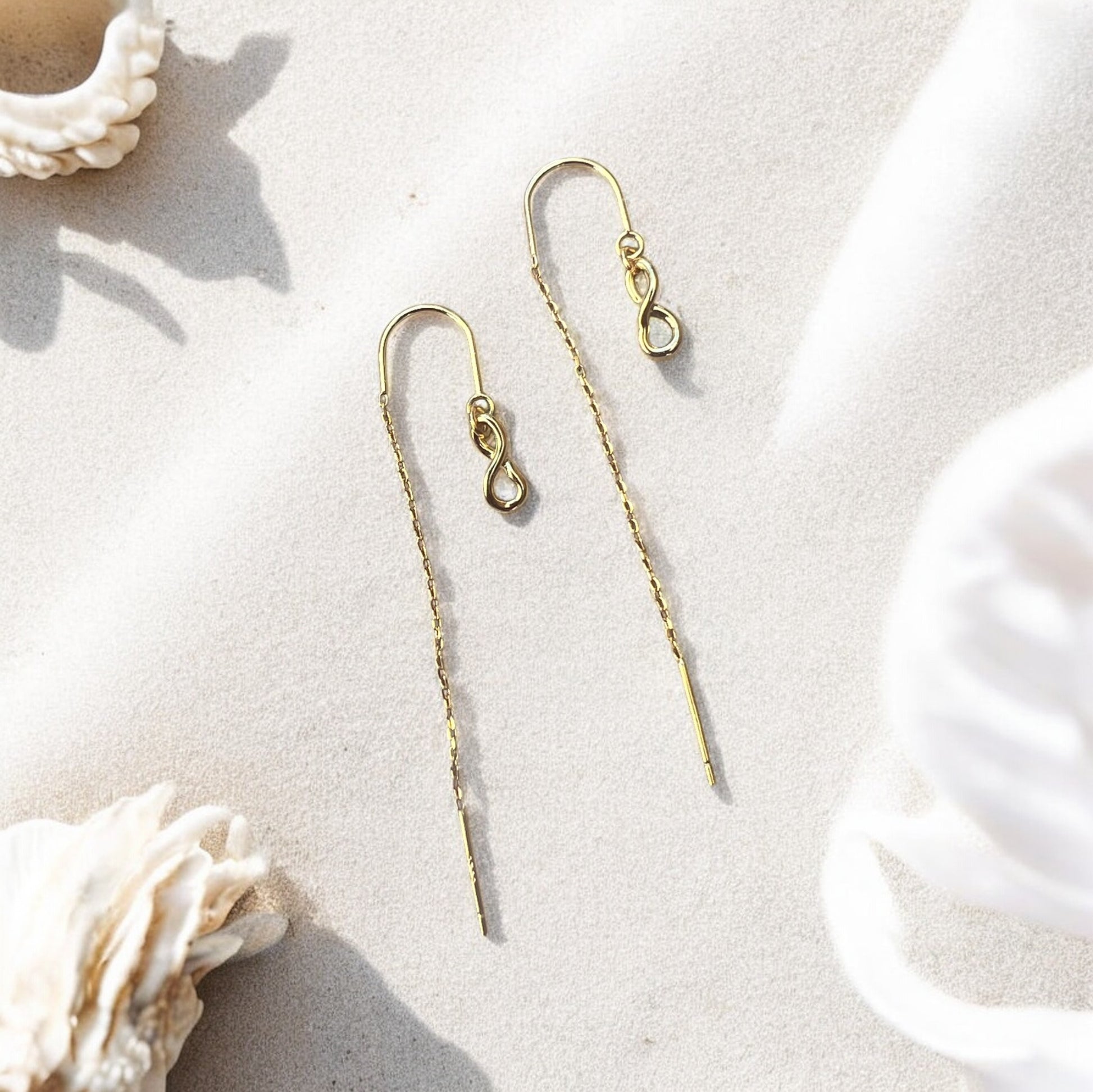 Smukke og lette øreringe med uendelighedstegn. Lavet i sterling sølv belagt med 18 karat guld. Et enkelt og tidløst design, der passer til både hverdag og fest.