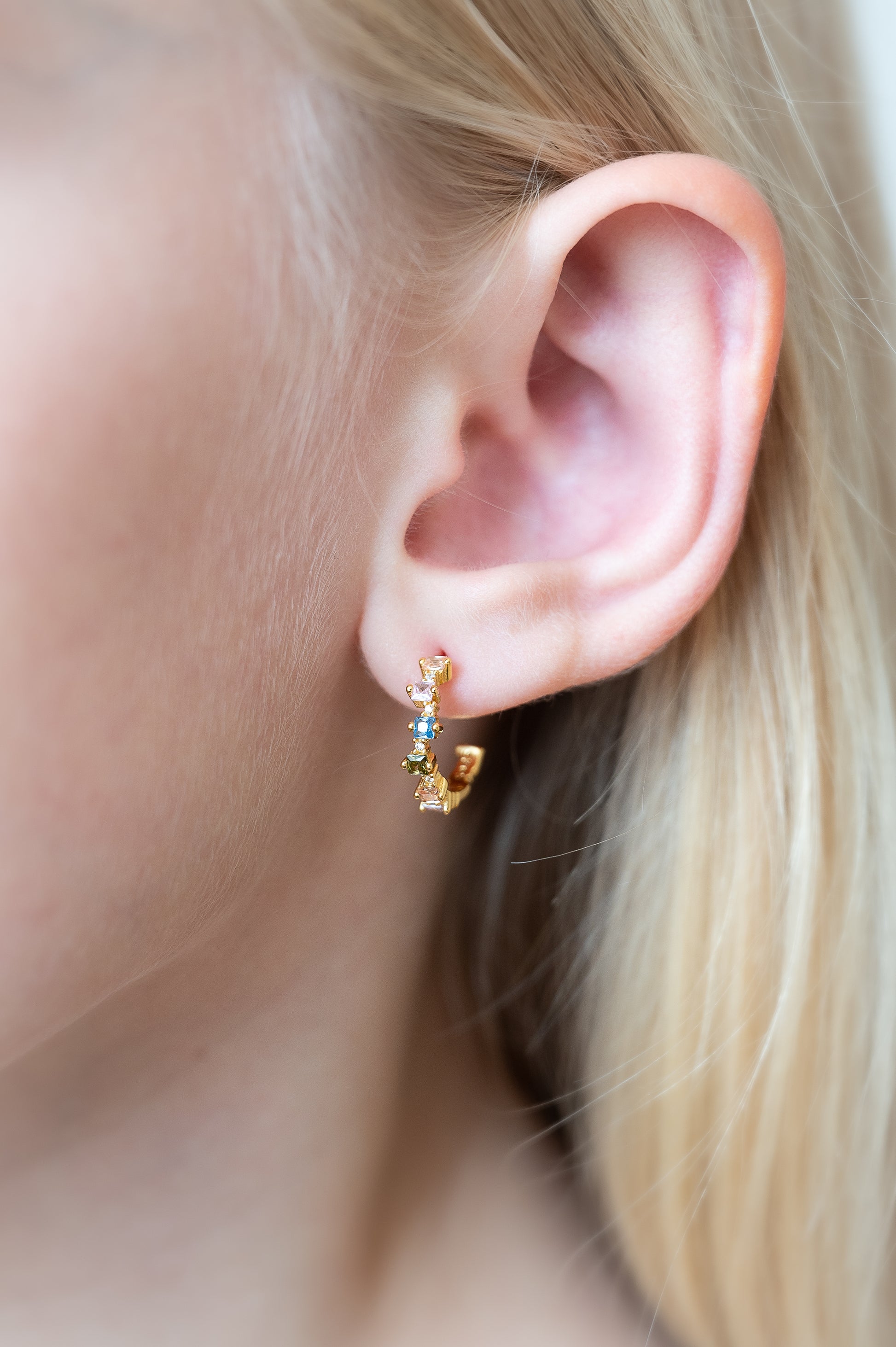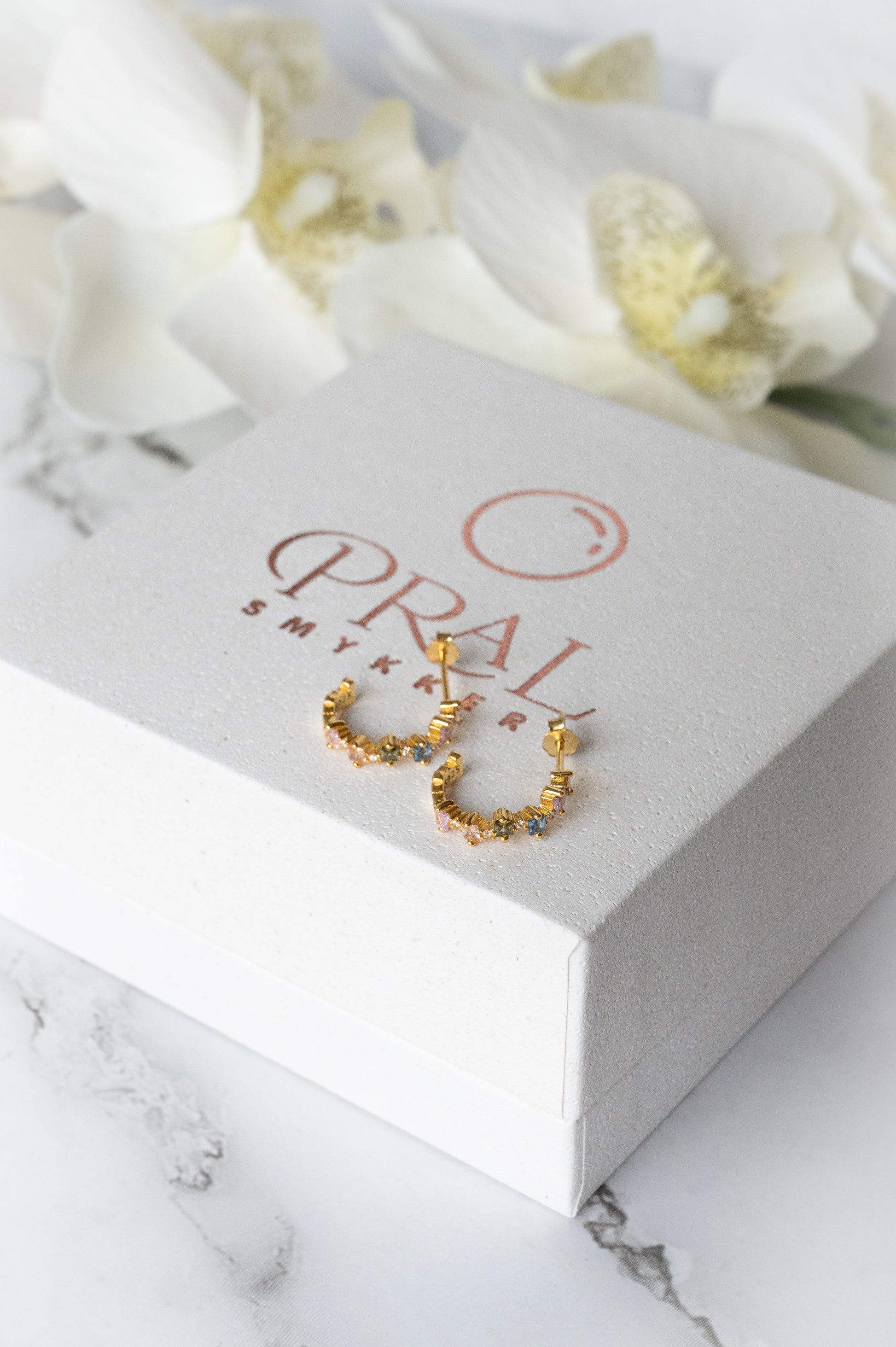 Elegante og lettere kantede halvkreoler i 18k forgyldt sterling sølv med små zirkonia-sten i pastelfarver.
