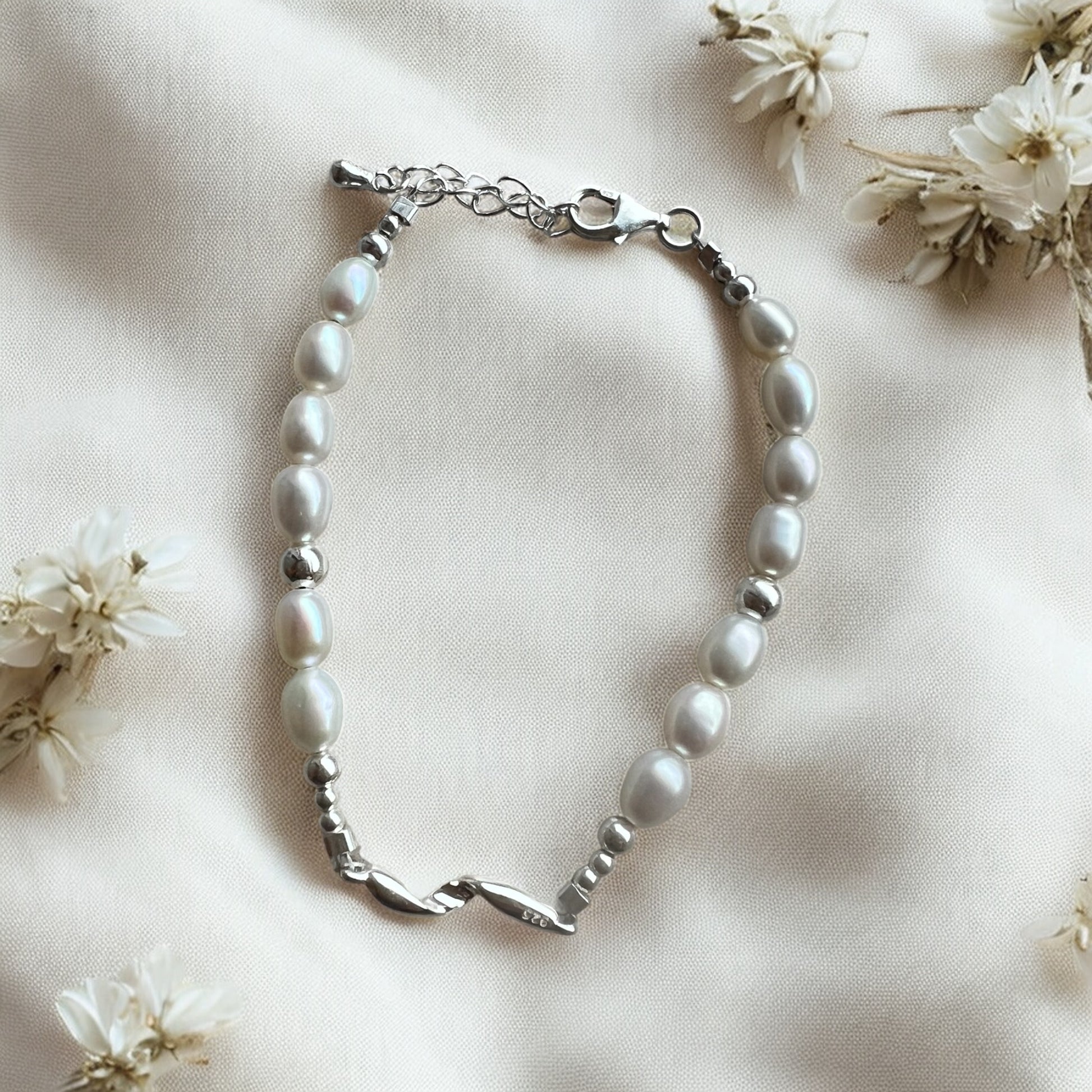 Et enkelt og elegant armbånd håndlavet i sterling sølv med hvide ferskvandsperler. Kombinationen af de bløde perler og de organiske sølvdetaljer giver armbåndet et roligt, feminint udtryk, der fungerer både alene og sammen med andre smykker.