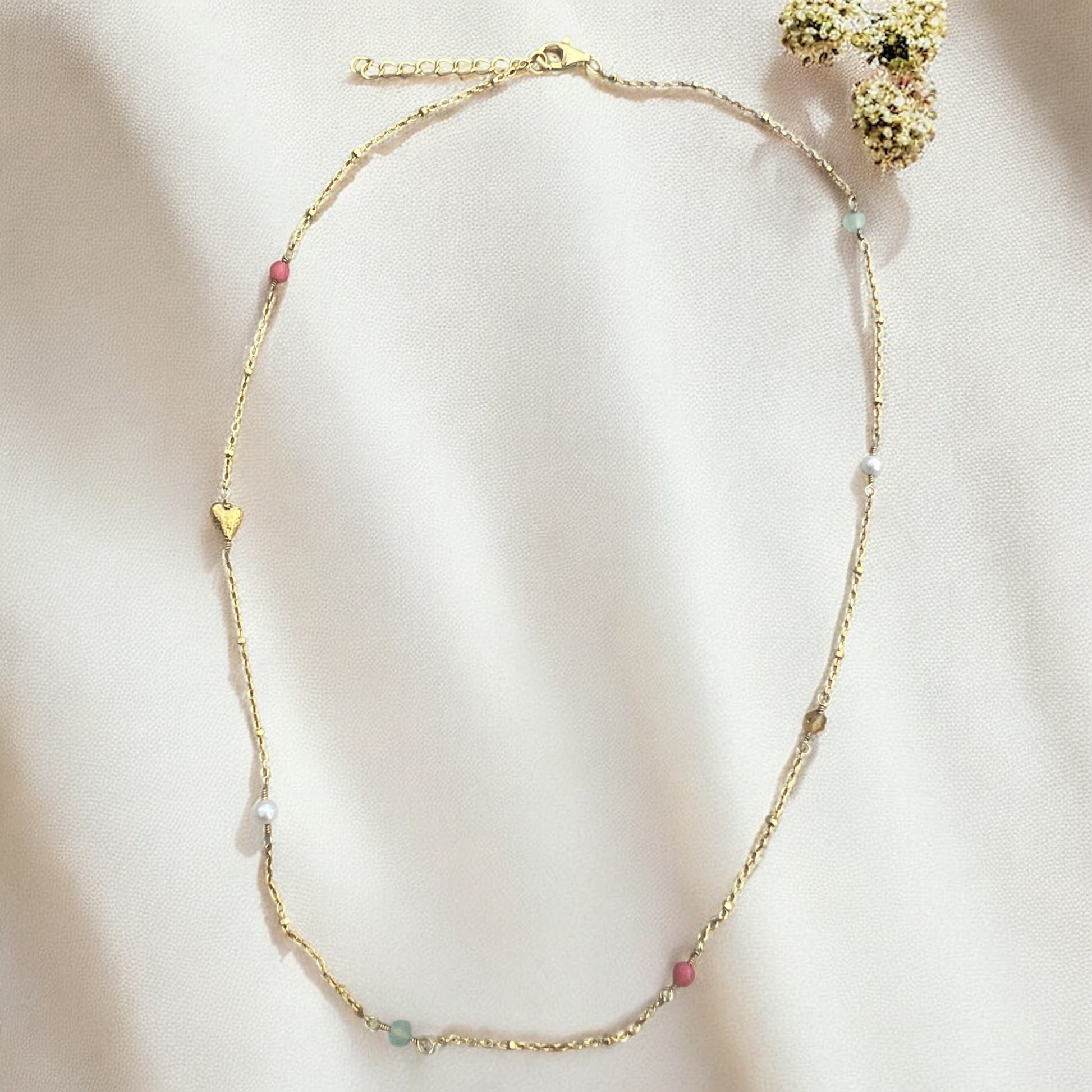 Elegant halskæde i 18k forgyldt sterling sølv med små ferskvandsperler, rød koral og grønne glasperler. Et lille forgyldt hjerte giver halskæden et legende og asymmetrisk udtryk.