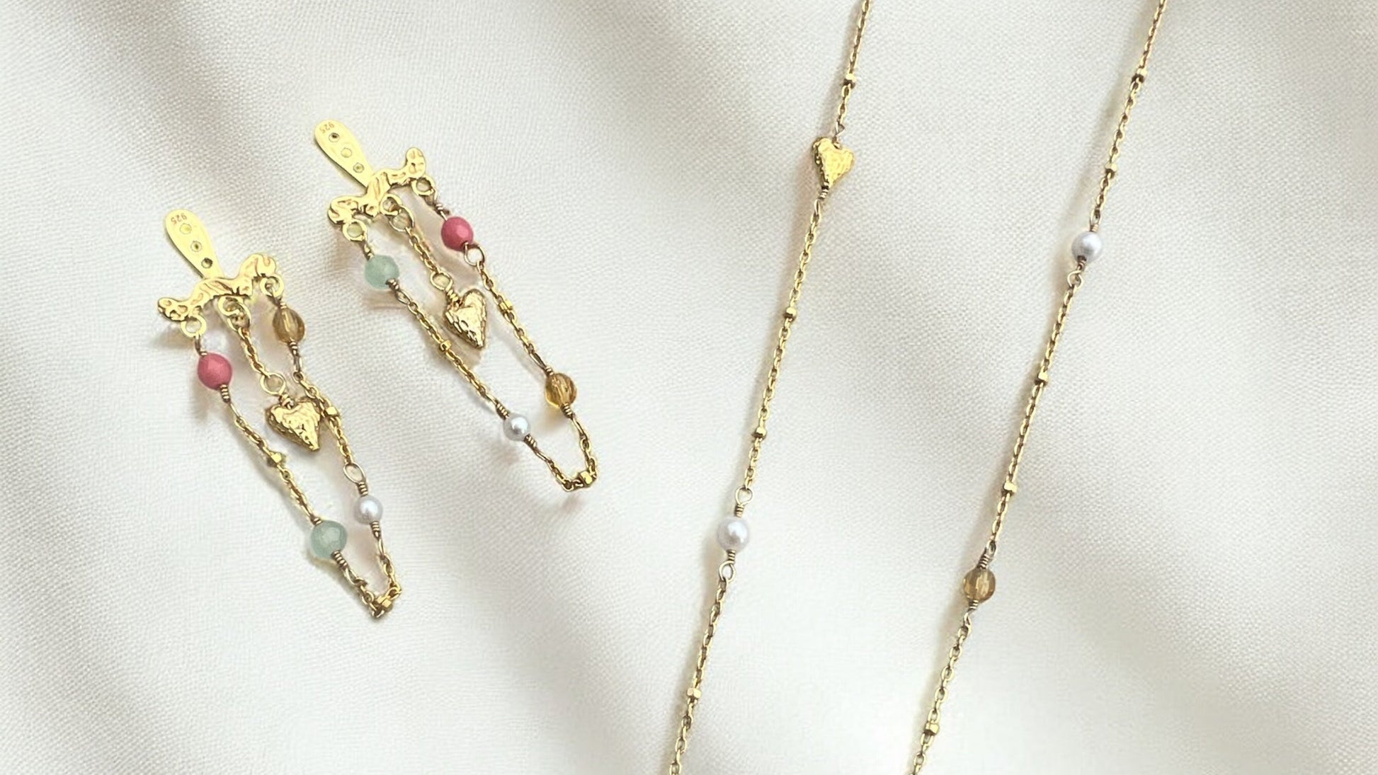 Materialer: 18k forgyldt sterling sølv, ferskvandsperler, rød koral, grønne glasperler