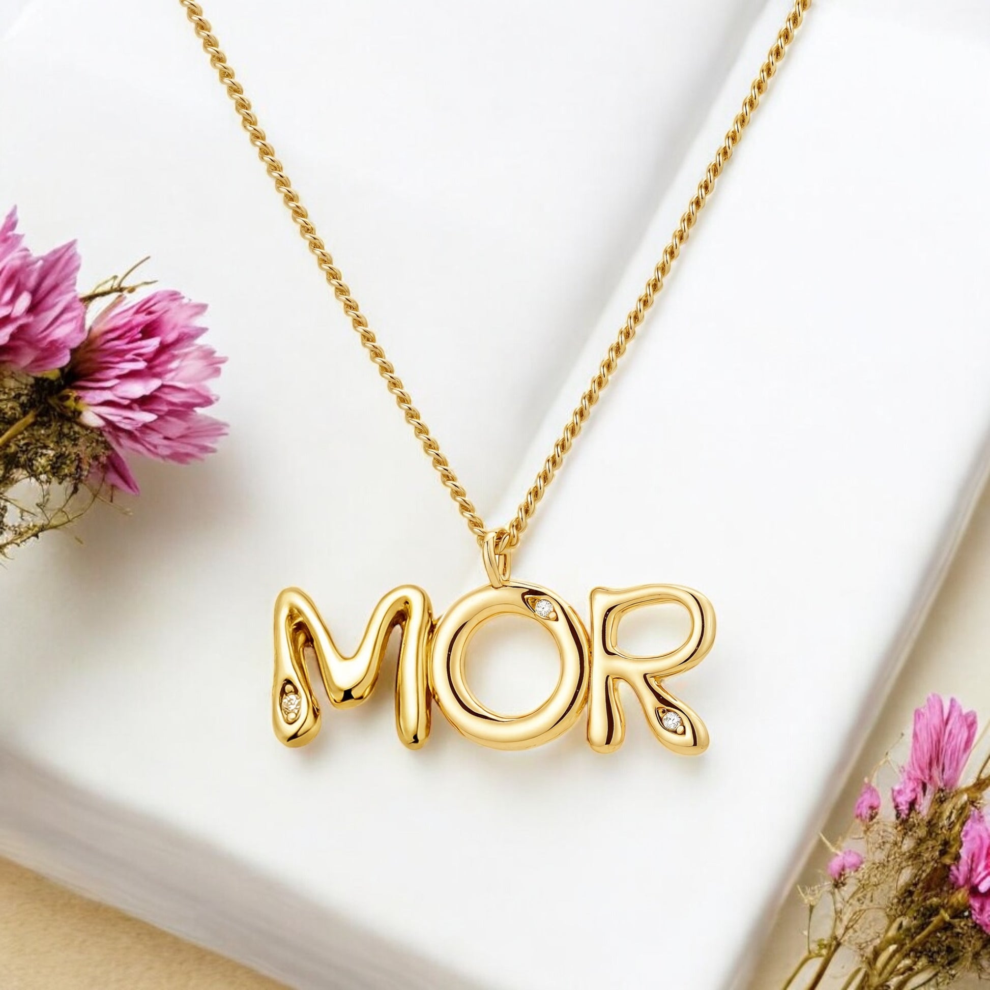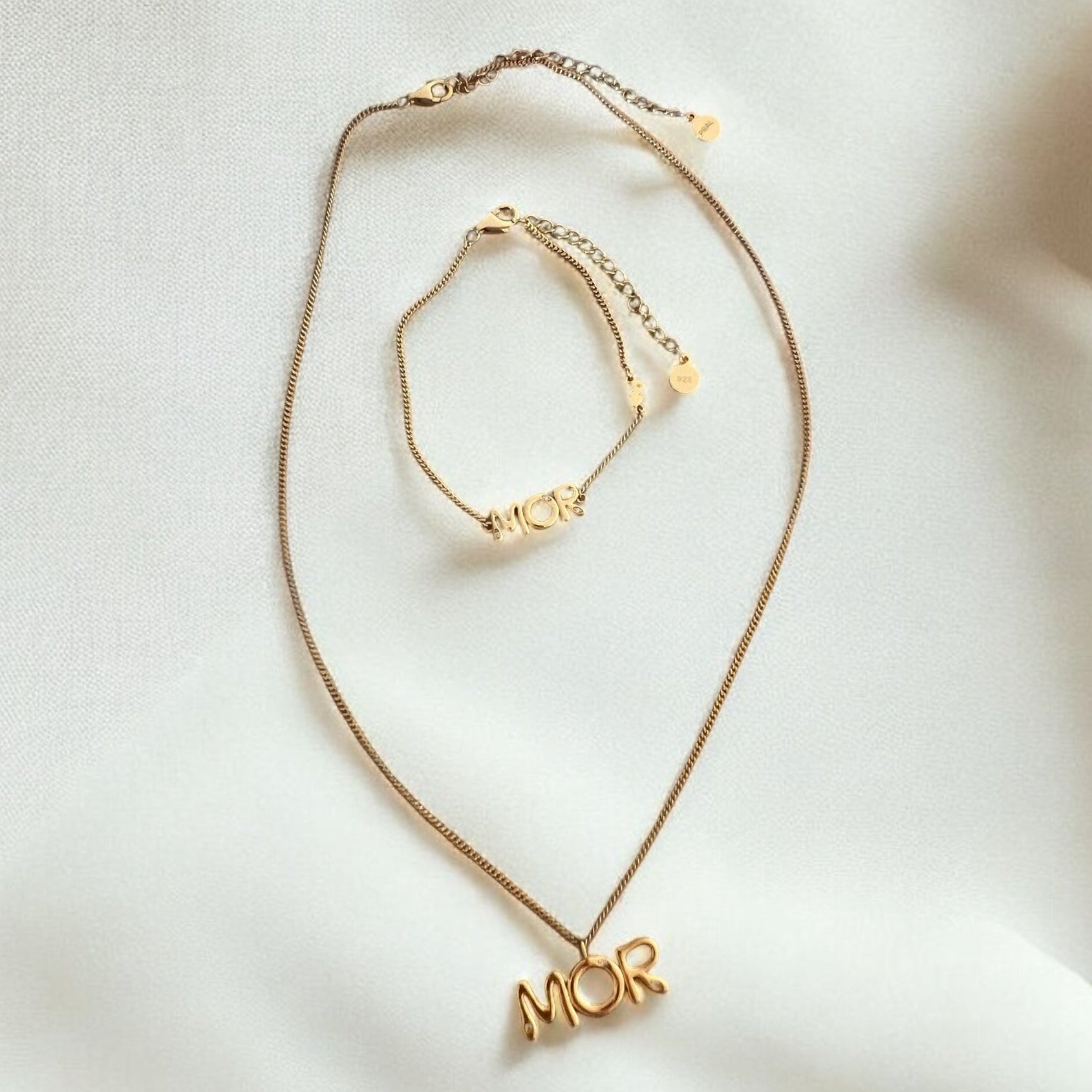 Et smykkesæt med et enkelt og personligt budskab. Dette sæt består af både halskæde og armbånd i 18k forgyldt sterling sølv – begge med “MOR”-design, men hver med sit udtryk.