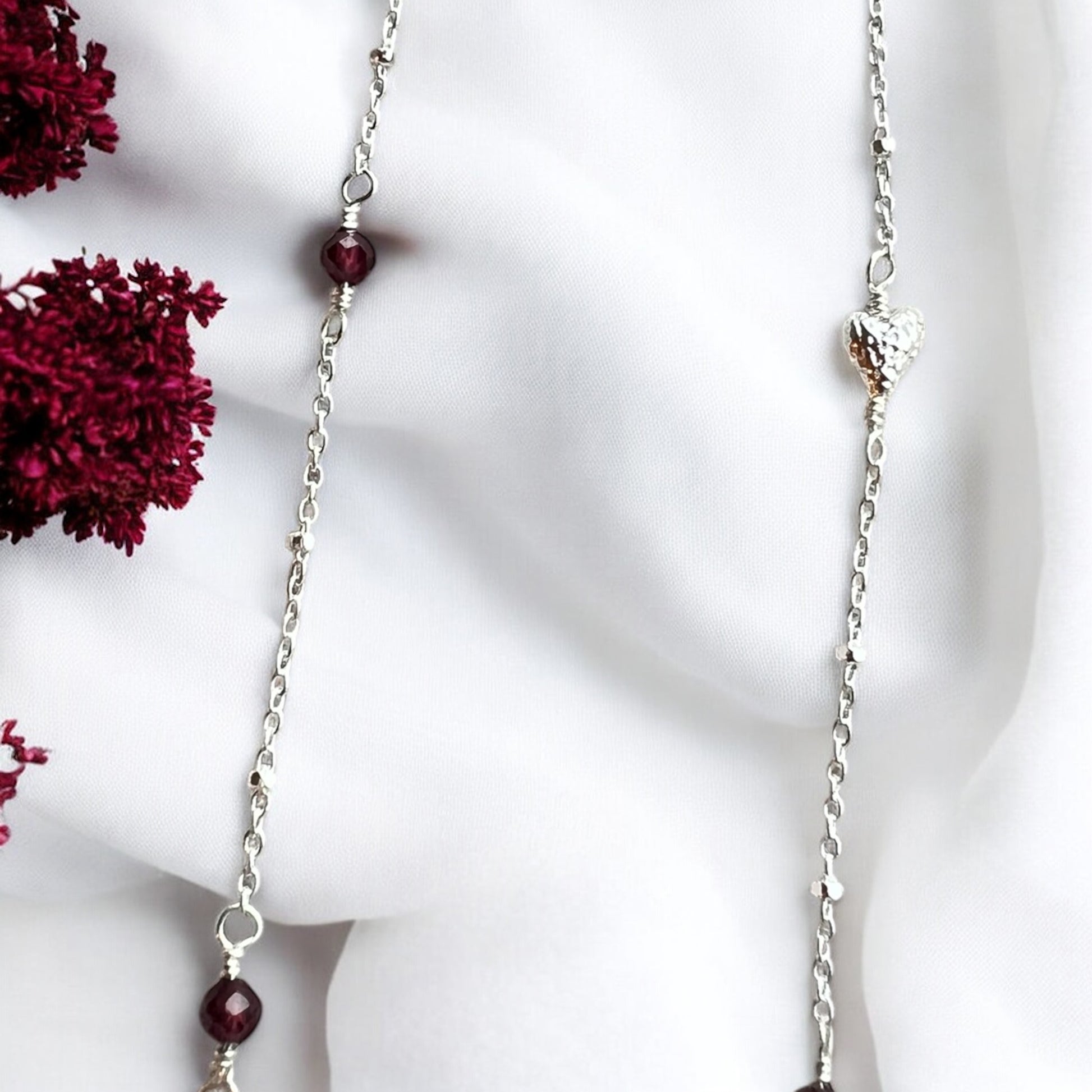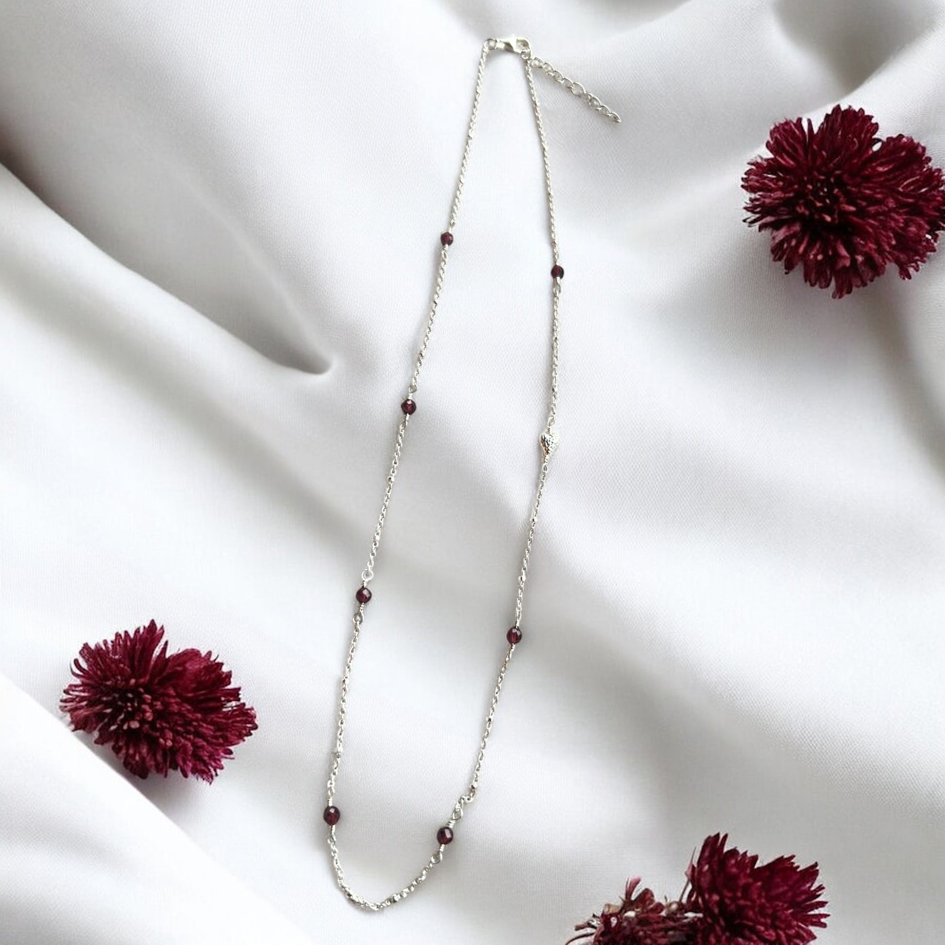 Noelle er lavet med dybrøde granater, der tilfører et varmt, elegant skær og gør halskæden oplagt både til decemberglød og klassisk hverdagsbrug året rundt.