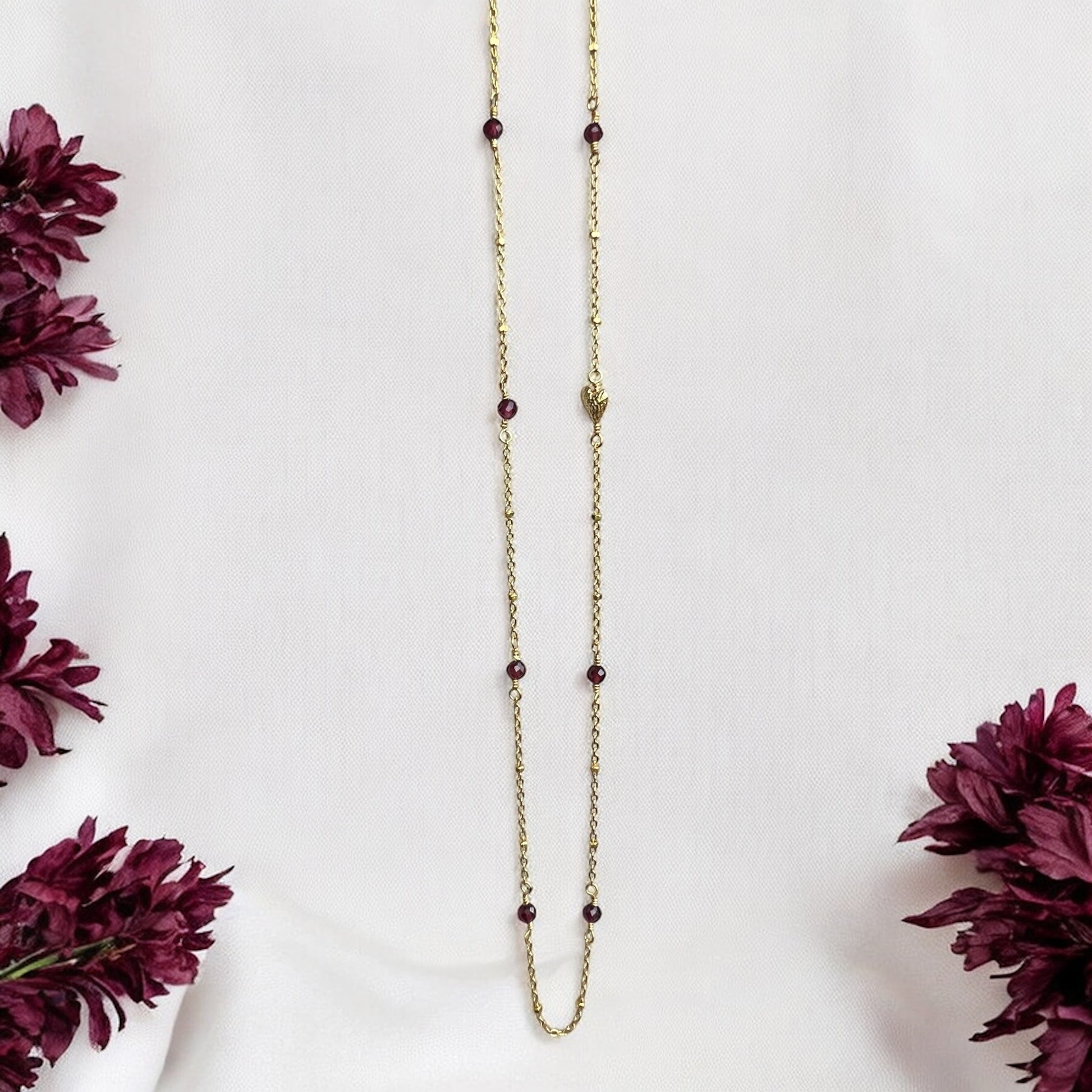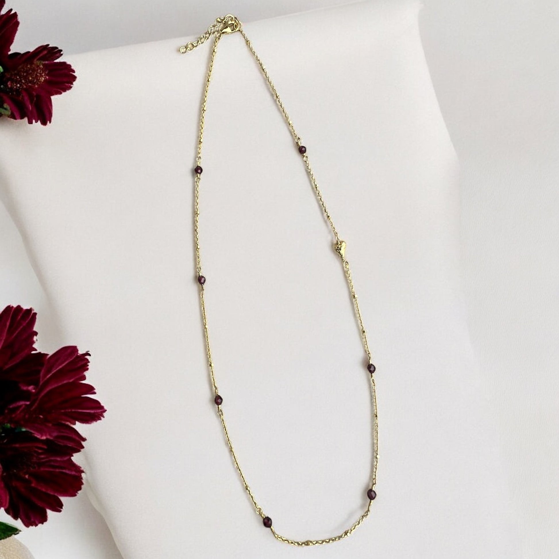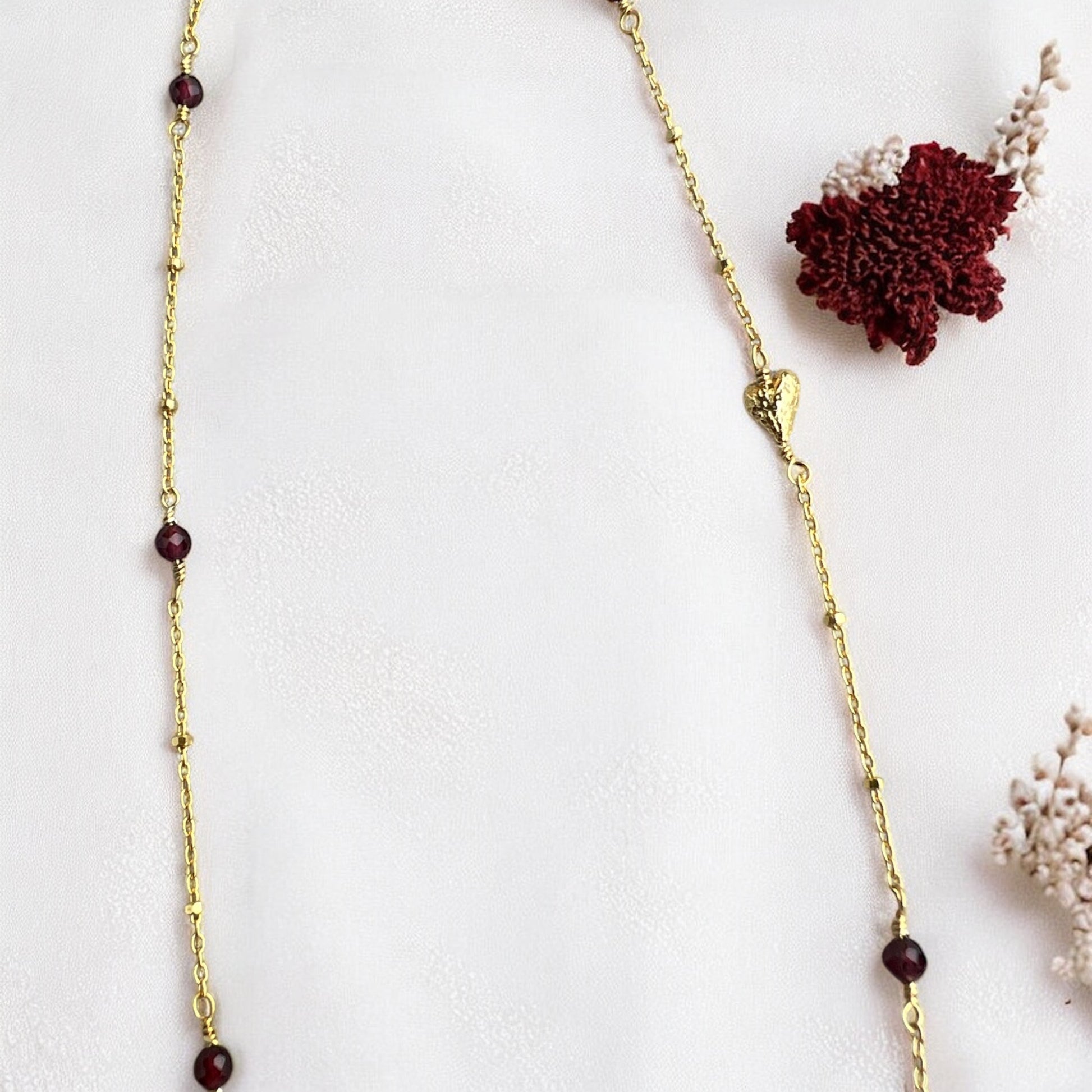 Noelle er lavet med dybrøde granater, der tilfører et varmt, elegant skær og gør halskæden oplagt både til decemberglød og klassisk hverdagsbrug året rundt.