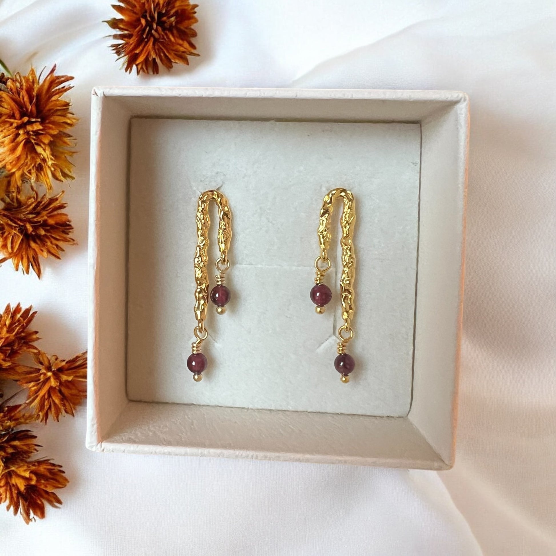 Elegante øreringe i 18k forgyldt sterling sølv med rå, organiske former og små dybrøde granatperler.