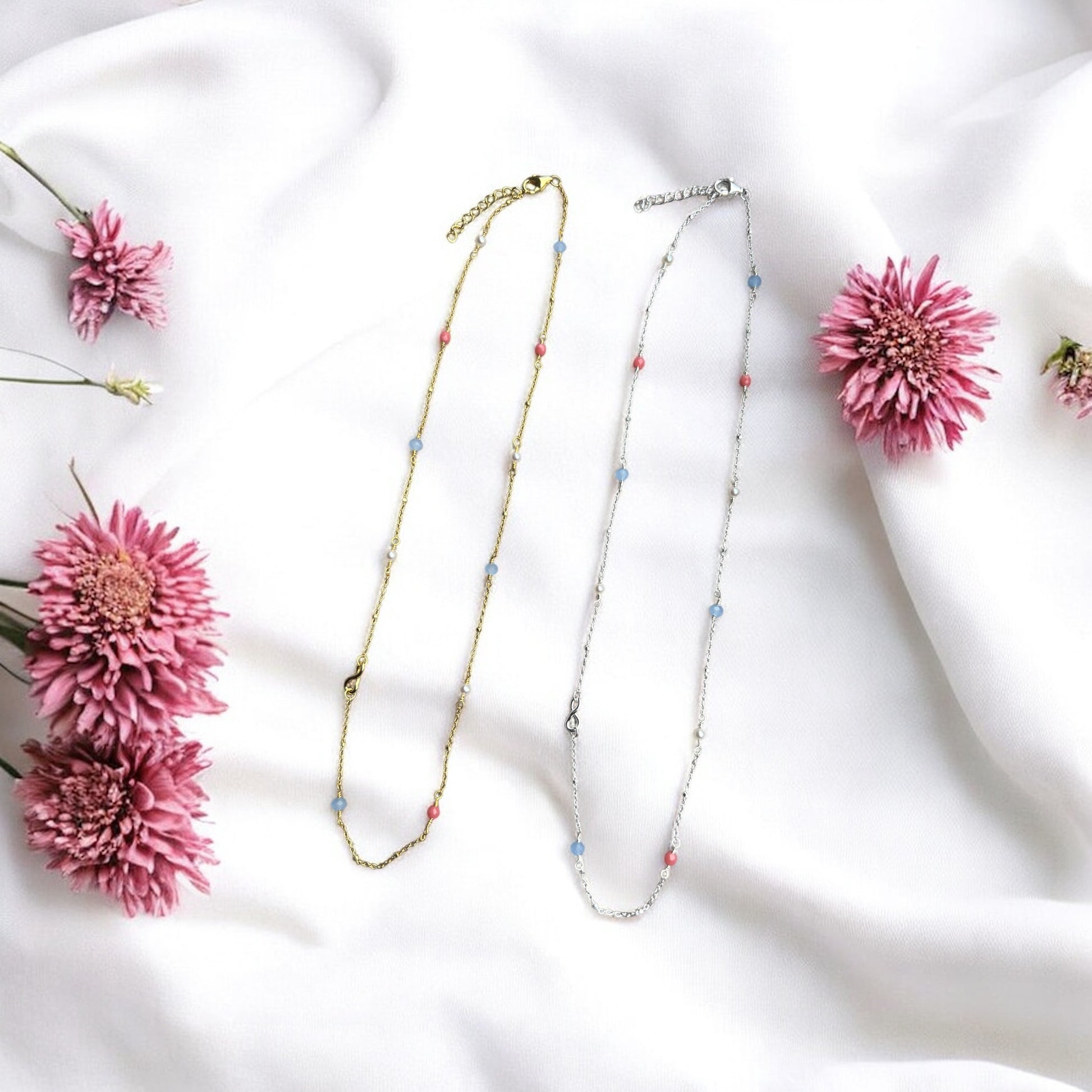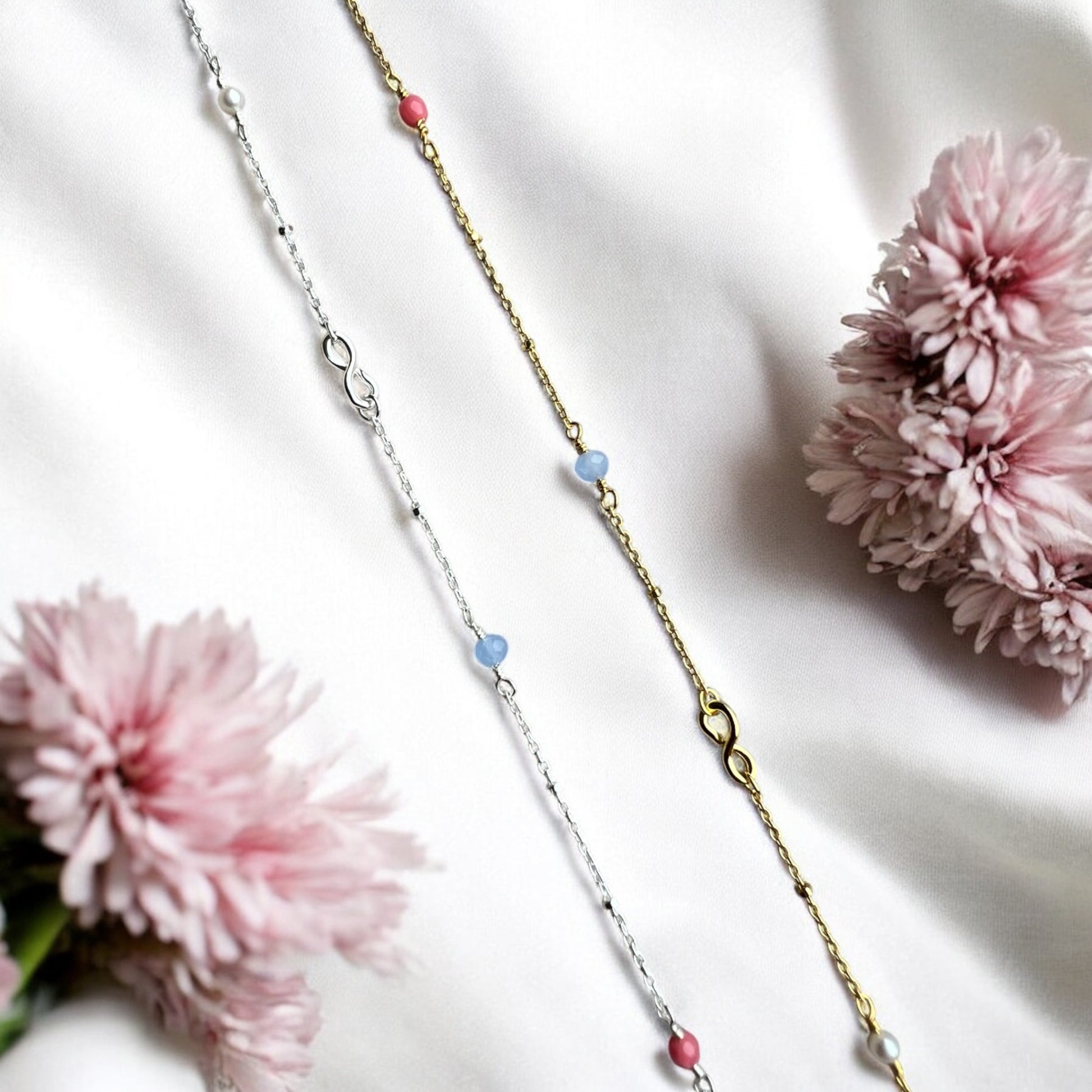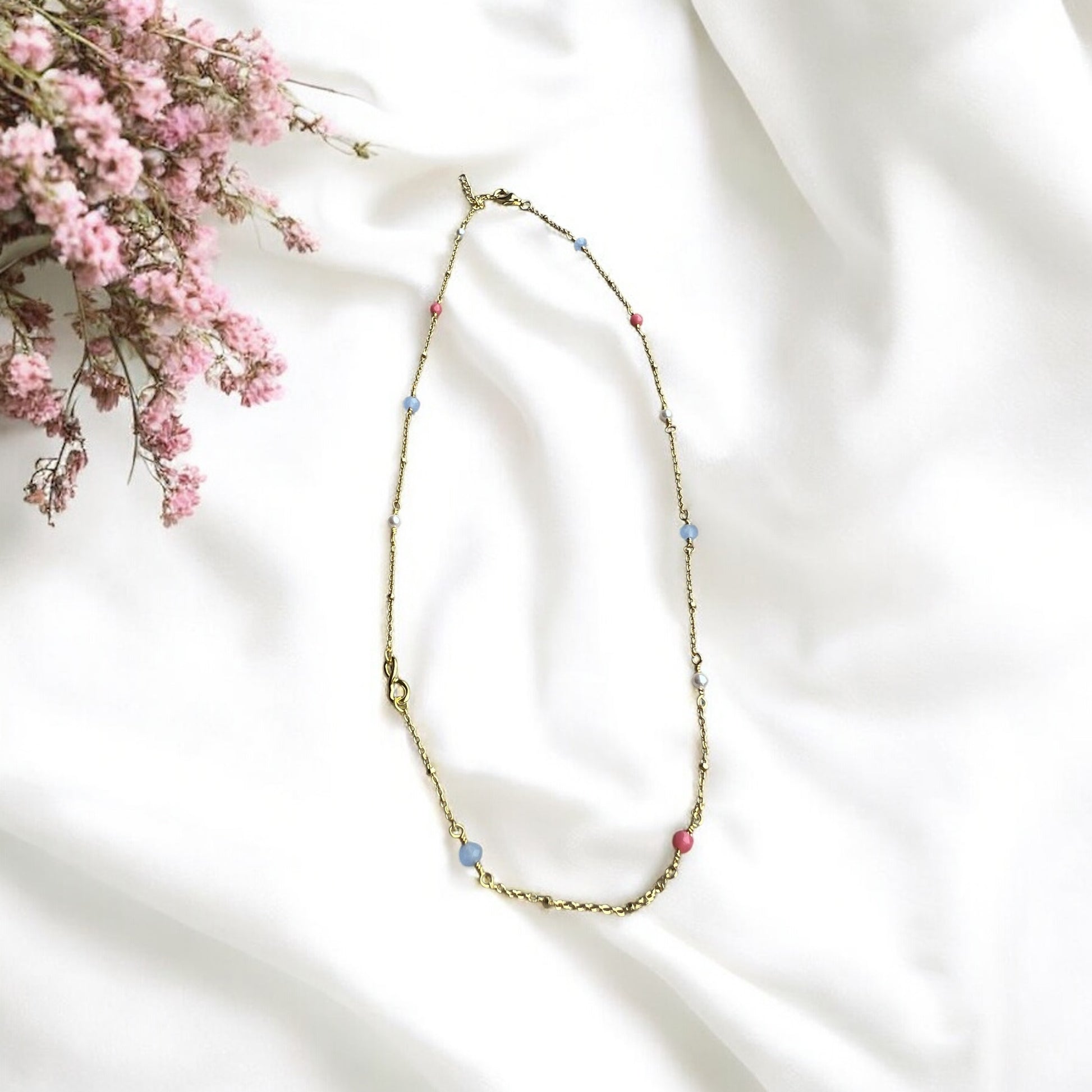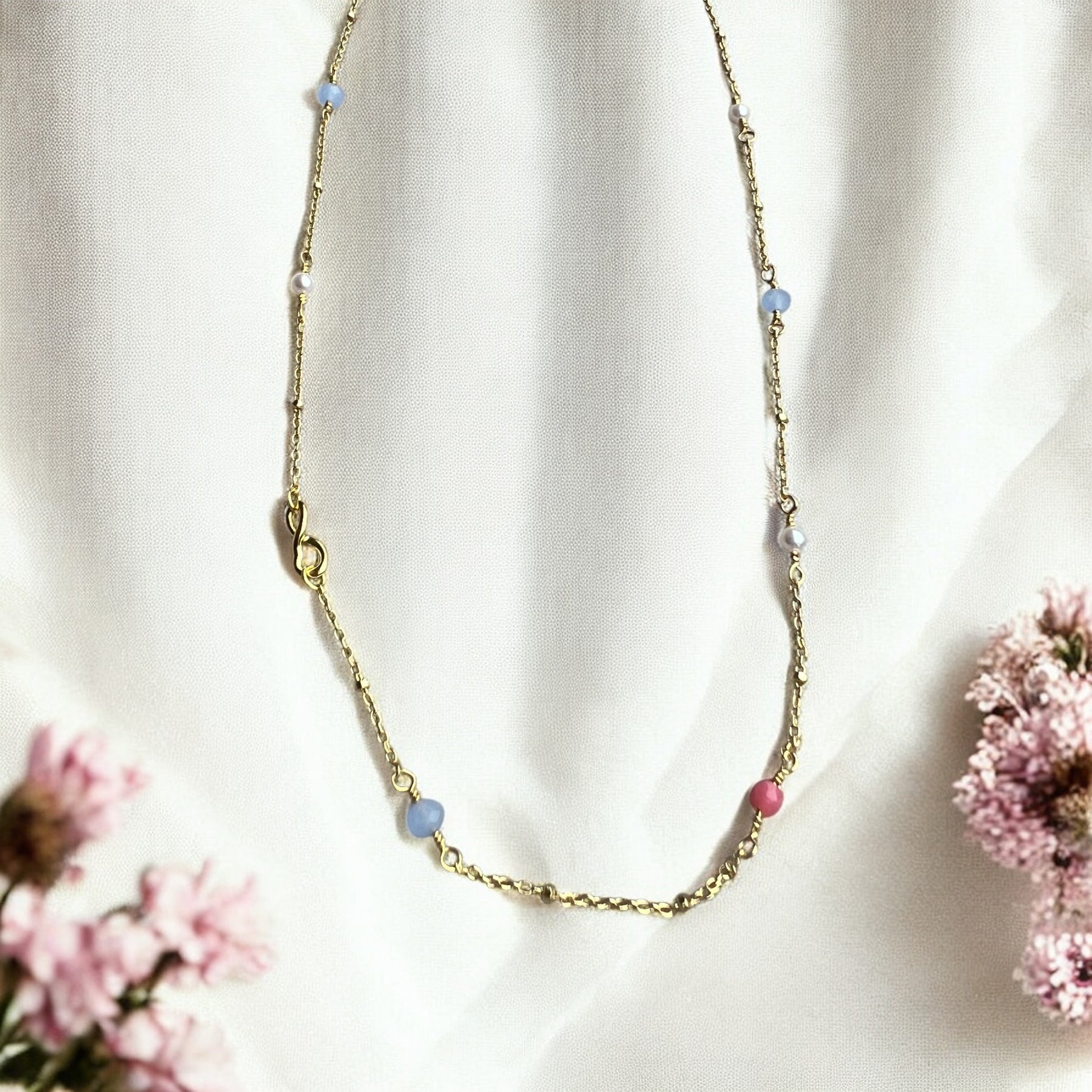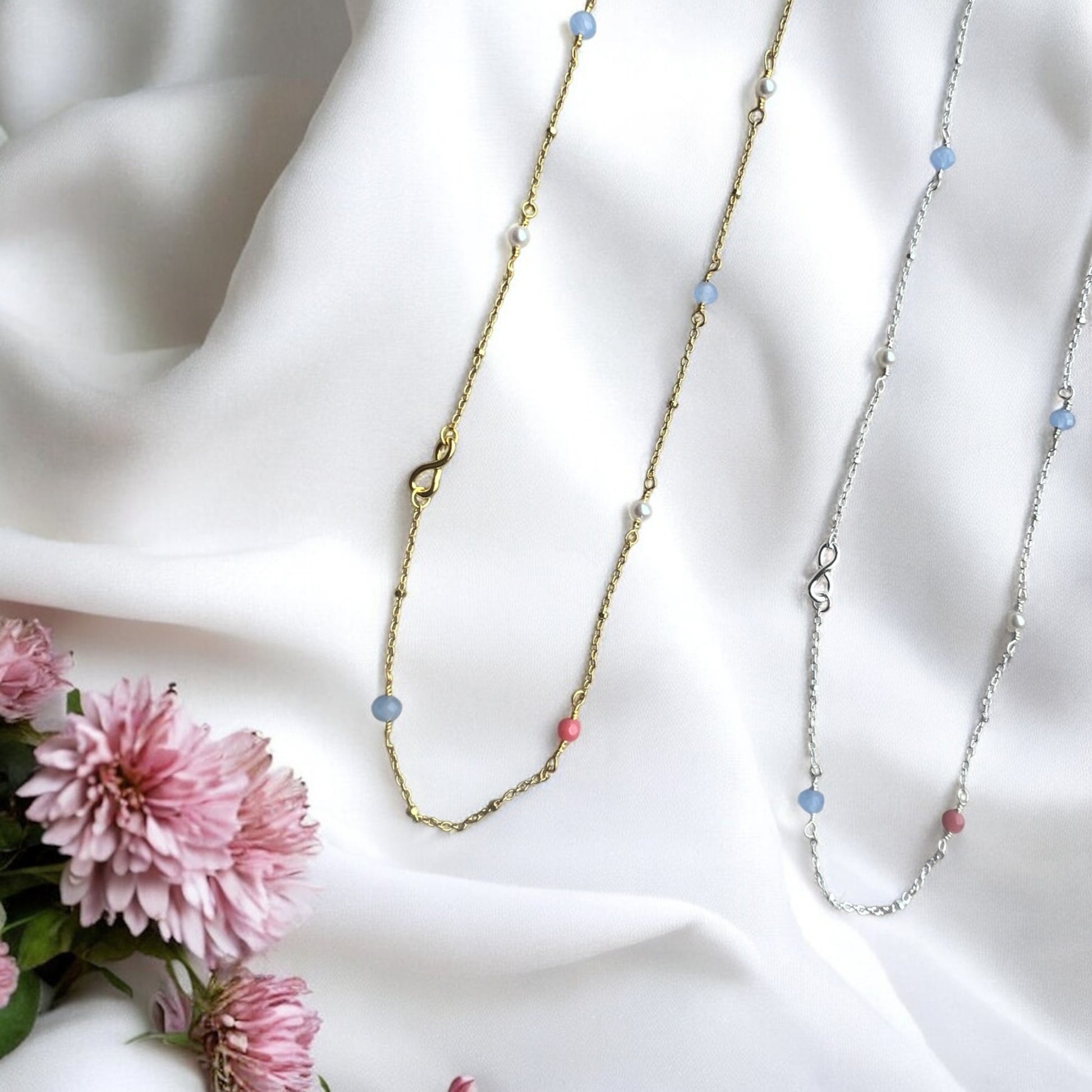Kæden er udført i 18k forgyldt sterling sølv med små kuber og kombineret med runde ferskvandsperler, pink/rød koral og blå glasperler. Midt i designet finder du et uendelighedstegn, som symbol på evig kærlighed og ubrydelige bånd. Halskæden har et asymmetrisk udtryk og en kort længde, der sidder tæt til halsen – et moderne, men tidløst look.