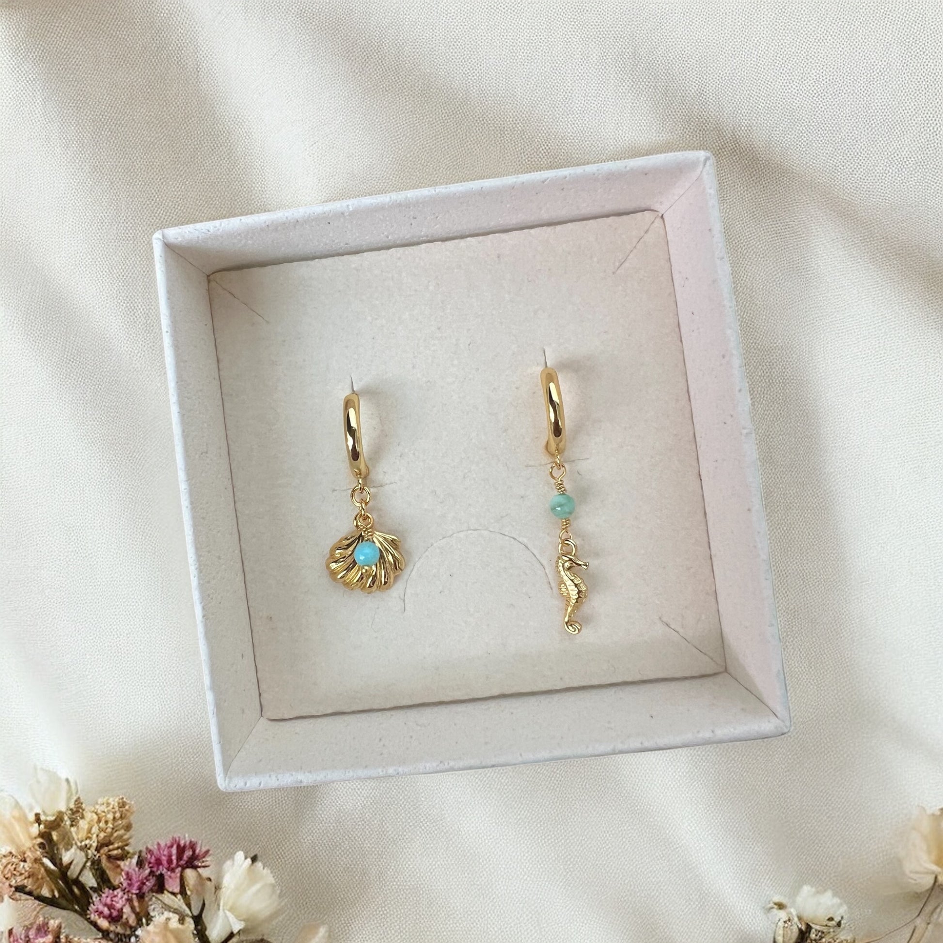 De sødeste øreringe i 18k forgyldt sterling sølv til dig, der elsker havet – og det lidt asymmetriske look. Den ene ørering har en søhest, den anden en musling med en lille turkis shell-perle af perlemor. Et legende og elegant sæt, der giver et personligt udtryk.